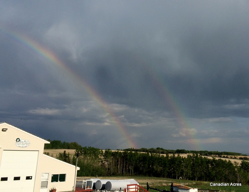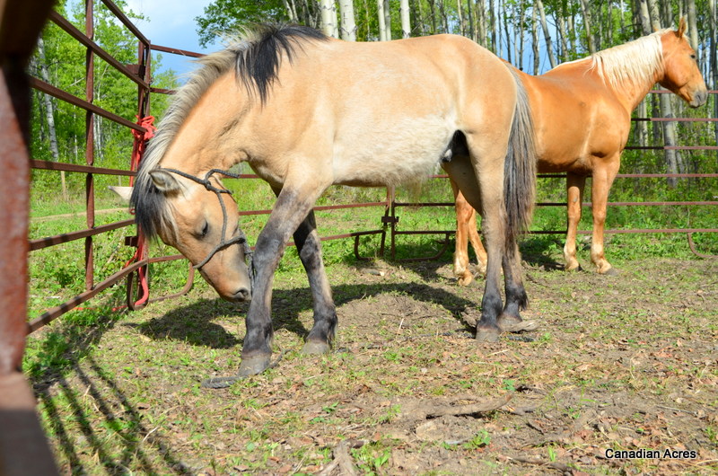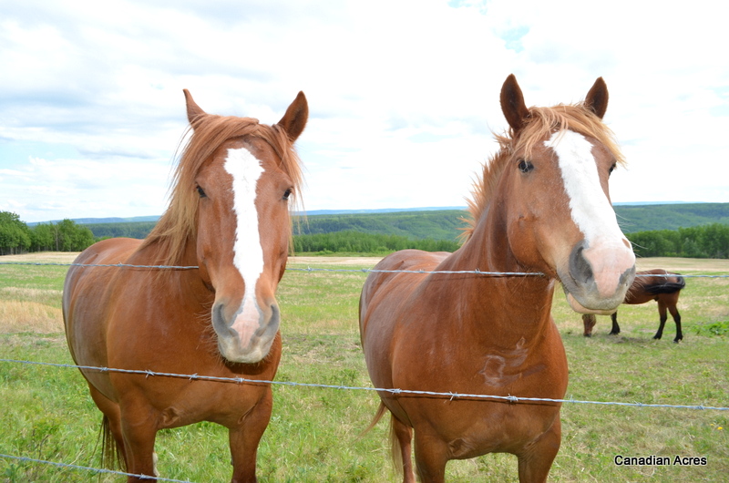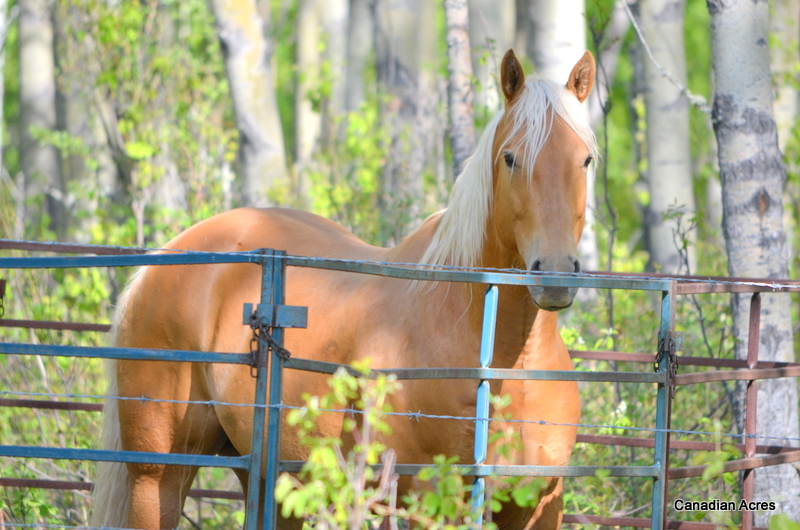 My father-in-law Timber finished the fencing for the horses a few weeks ago and literally the day after it was done, horses started to arrive at Canadian Acres. I guess it is true, if you build it, they will come. Clay’s Aunt and Uncle graciously let us borrow two riding horses as they needed some miles put on them. Their names are Ranger and Rover and they are such dolls. Maynard just loves to give them kisses. Clay and I went riding one rainy evening and explored the property on horseback… what an amazing feeling to actually do something you’ve dreamed of since the beginning. A few days later, some friends dropped off their horses to stay for the summer, and a few days after that, our new range stud showed up with Timber’s new horse… I’m in horse heaven!