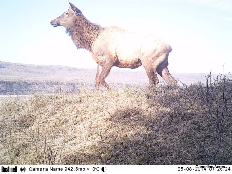 Yesterday I finally took a moment (in between building my hugelkultur flower bed and finishing painting the power shed…what can I say, I’m an excellent multitasker) to hike down to our game cam and grab the photos. It’s been un-checked for about a month and I was anxious to see what summer would bring to our game highway. Apparently, a lot of things! Lots of elk and deer, a moose, a coyote, a dirt biker (hmmmm… they must have missed our blatant No Trespassing signs), a porcupine and a gorgeous but wily looking wolf. What a very busy month it has been.