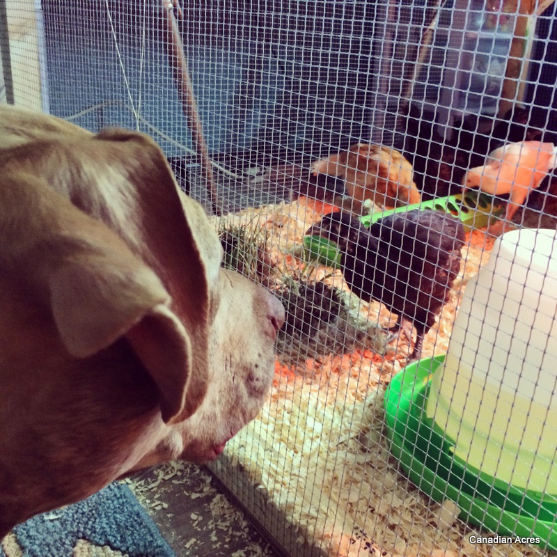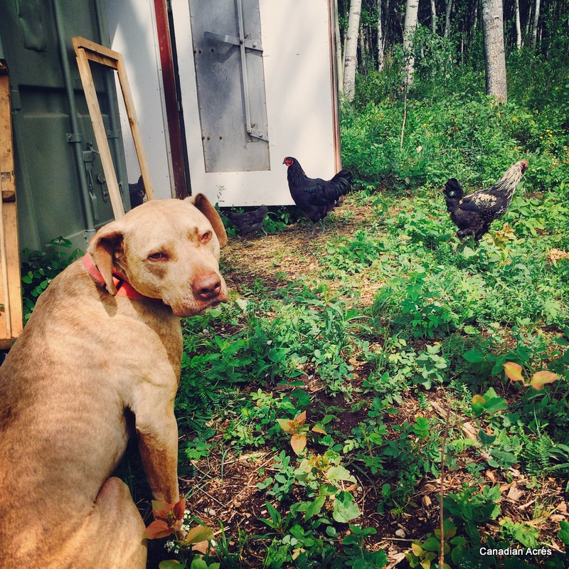 After moving the chickens to the coop, the dogs enjoyed heading out with me in the mornings and evenings to do my chicken chores. The chickens were always in their very safe chicken run so the dogs got a chance to interact without fear of anyone getting injured. As I cleaned the coop and fed and watered, the dogs took their jobs very seriously by walking the perimeter and peeing on any and every bush that surrounded the area. Great predator proofing in my book.