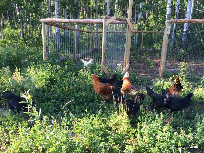 Free-ranging has become a necessity at Canadian Acres due to lack of space for so many roosters and having different sized and age grouped chickens. The older bunch are closing in on being 18 weeks old whereas the littles are going to be 8 weeks old. After being scared to death that the bigger chickens would immediately kill the smaller ones if put in the same pen (thanks a lot internet), I’ve been isolating the two groups in the coop. Everything was going smoothly until I had to start isolating certain hens from the roosters as well. Then I quickly ran out of room in the brooding pen. I currently have 12 large chickens in the roosting area with access to the run (coop plans found here) and 12 littles and 2 large chickens in the brooding area with no access to the run. So, being the wonderful chicken mama that I am, I felt bad on these hot sunny days and started letting the littles and Ethel and Beatrix out to free-range during the day.