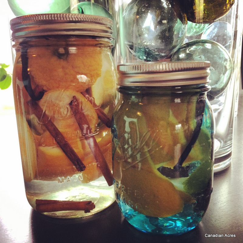 Peel the citrus and divide the peels between the canning jars. I then proceed to juice the citrus and drink it. Break the cinnamon sticks in half and add. Slit each vanilla bean and add to the jars. Pour enough vinegar or vodka into each jar to completely cover the peels leaving at least 1/4 inch headroom in each jar. Screw on lids and set jars in pantry or on the kitchen counter to age. Shake the jars every few days to mix. The spray is ready to use when the liquid starts to turn an orangish-tan color, usually within one to two weeks. Strain the contents into a spray bottle and enjoy! The cinnamon sticks and vanilla beans can be reused for a second batch, but use fresh citrus peels.