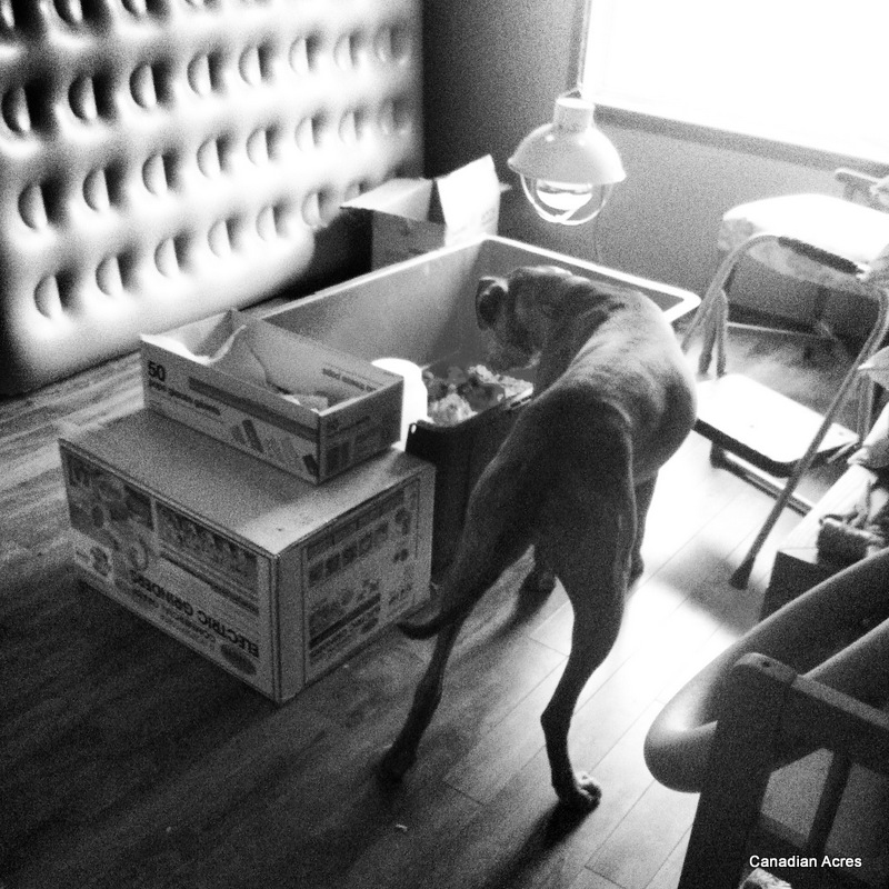 I also took a few Bantam Frizzle Cochins to boot. I call them my stinky-crazy-haired bunch, the lot of them. Maynard is stoked on more babies in the house and checks on them regularly, and Wyatt is stoked on the open bag of chick food in the guest room.