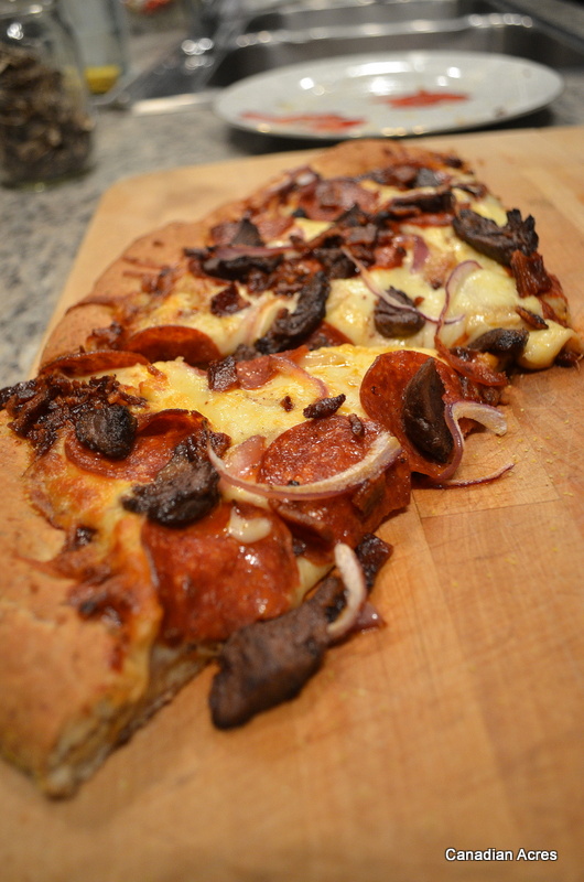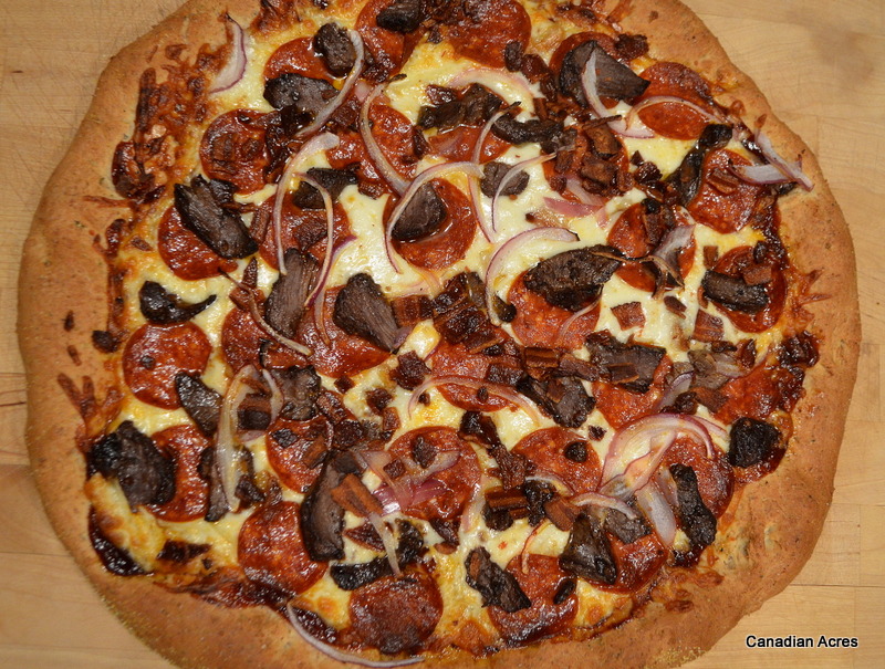 The meat component is always a factor as my husband is not one to go vegetarian anytime soon. Well, I did have pepperoni, but wanted to kick it up a notch, so leftover venison from our fall Mule Deer came to the rescue… at least I hoped so. I decided to do a version of my favorite Moose’s Tooth pizza (an Anchorage pizzeria and brew pub), the Avalanche, complete with BBQ sauce, bacon and red onion, but make it a little more Canadian Acres.