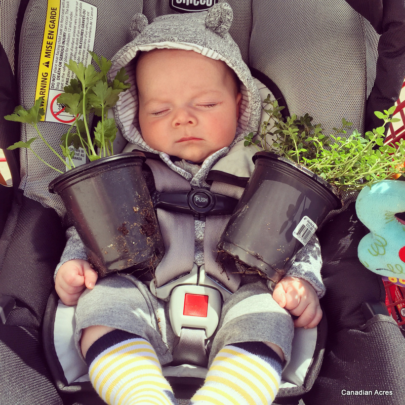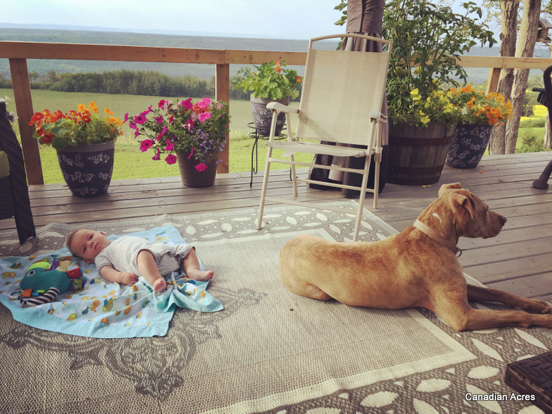 Baby wearing has been a lifesaver for both of us. Yes, that’s right, my husband (proudly) wears his son, often. It frees up our hands to get chores done and is also a convenient way for me to ride with him in the SxS. We also relied heavily upon our Pack n’ Play, our stroller and a shade gazebo we put up on our deck. The days get very sunny and hot in the summer and it was imperative that I had a sanctuary for the baby as well as the dogs and me. We also made adjustments so I could have some garden areas closer to the house which made it easier to tend and gather dinner supplies. It all worked out to be a great system for us.