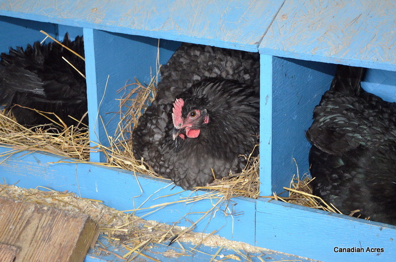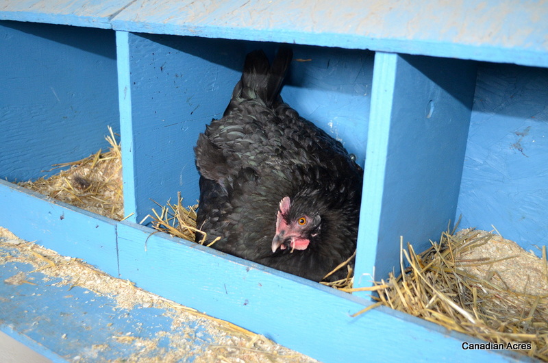 Evening came and I snuck out with a basket full of eggs I had been saving. 9 in total – 4 orpington eggs and 5 olive egger eggs. I arranged them delicately in the nest and moved Josephine over to see them. I made sure to wear gloves because broody hens love to peck and bite! She hesitated a bit and had a slight panic over being outside of the nesting box, but then she began to eat a little and I figured I should leave her to it. She was either going to sit on them or not. I don’t know how long she was off the eggs, but when I returned a bit later, she was up again. I scooped her up and settled her on top of them and she settled right in. A good sign.