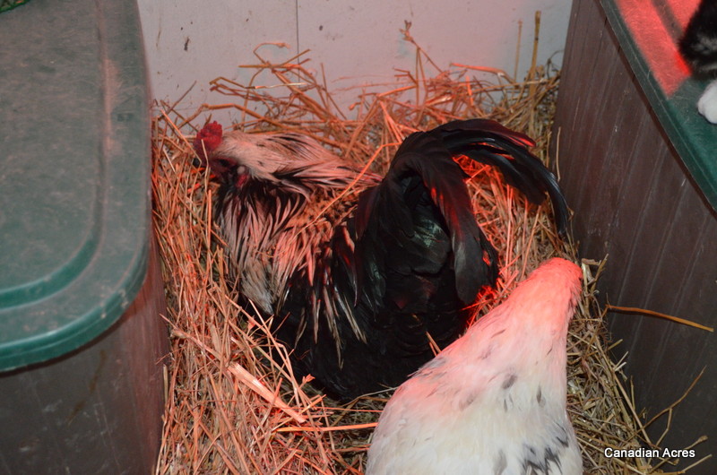 It takes 21 days to hatch an egg, if everything goes just right. We have cold temps working against us, but I figured I could set up the nursery under the heating lamp to help things out. Google said it was easiest to move a broody hen in the evening so I prepared the nursery yesterday during the day to make sure it was ready. I piled up a bunch of new clean straw in between two feed bins under the lamp and to my surprise, Beatrix my rooster began to prepare the nest for me. It was the darndest thing… and ridiculously adorable. I’ve never seen anything like it. He got right in there and turned and groomed the straw, all the while making cooing and clucking noises. He was very proud of himself. Such a good Dad-to-be. Apparently this is a sign of a good rooster… I knew he had it in him.