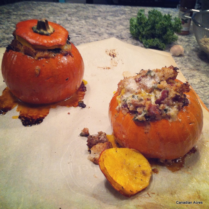 Preheat the oven to 350 degrees. Place parchment paper on top of a cookie sheet. Cut a circle into top of pumpkin around stem (like a jack-o-lantern) and clean seeds and innards from inside as well as from top. Save seeds for roasting or feed to chickens – the love ’em. Generously salt and pepper the inside of the pumpkins and place on parchment paper. Saute bacon until crisp and add sausage. Cook for about 3 minutes and add in garlic and onion. Cook for an additional 5 minutes and add walnuts and kale, stirring to wilt the kale and cooking until everything is hot and smells delightful. Season to taste. Add mixture to bread chunks and cheese and mix thoroughly. Stuff into pumpkins. Add salt and pepper to the cream/nutmeg mixture and pour over stuffing into each pumpkin, making sure that the mixture becomes moist. I did this in steps to ensure the bread absorbed some of the liquid. Place lid on each pumpkin and cook in oven for 90 minutes – 2 hours. It’s done when pumpkin is easily pierced with a knife.